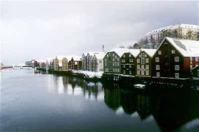The Nidelva flows through Trondheim with old storehouses flanking both sides of this river. The Nidaros Cathedral and Old Town Bridge can be seen on the left side of this panorama.